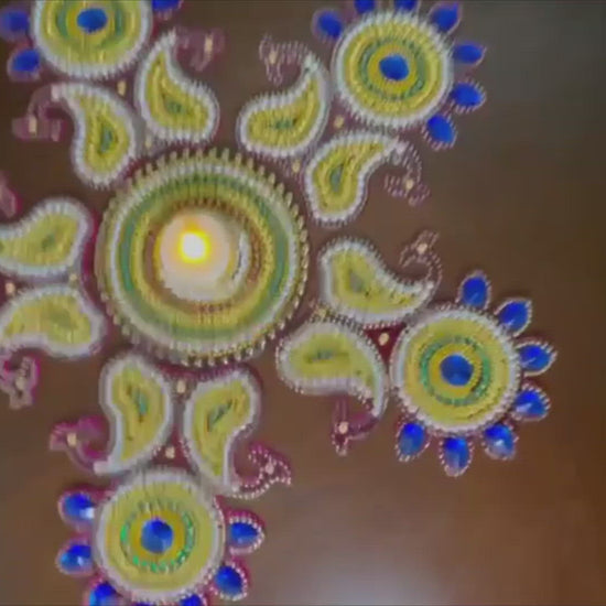 The peacock is designed in flirty pink and blue with a dash of ornamental pearls and golden nuggets. The core has a candle holder for the design to shine. The peacock is versatile as pooja decor, on dining, coffee or entry way tables.